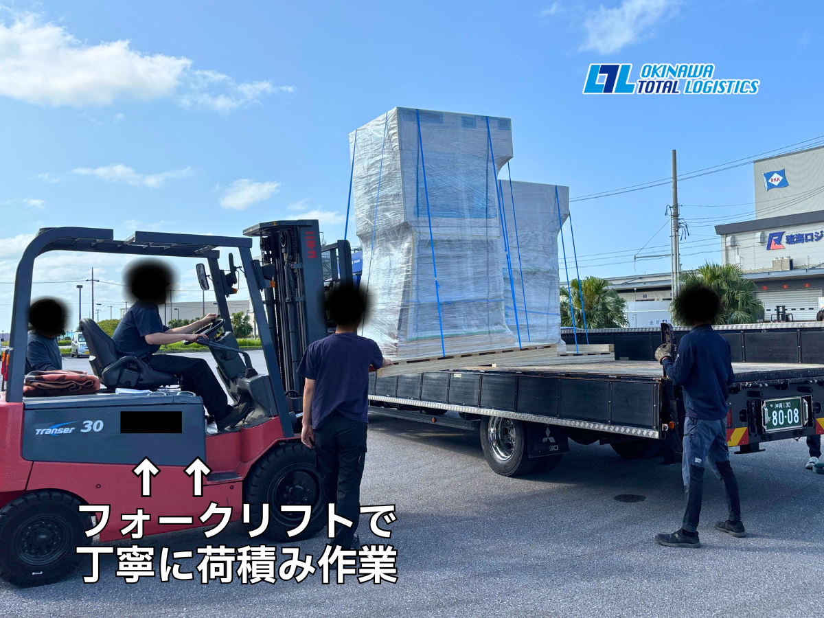 重量物でデリケートな機械のため、丁寧にフォークリフトで作業をします。